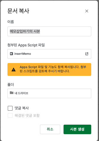 사본만들기 하시면 앱스크립트도 같이 가져 가는 것 같습니다 .