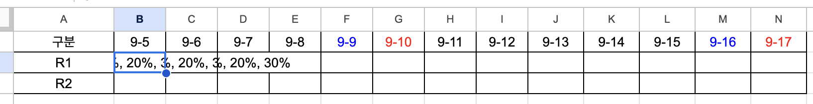 var range = sheet.getRange("B2:N2"); //입력할 영역을 선택하세요.
