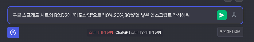 | To insert the text "10%, 20%, 30%" into cells B2:D2 of a Google Spreadsheet using Google Apps Script, you can follow these steps: Open your Google Spreadsheet. Click on "Extensions" in the top menu, then select "Apps Script" to open the Google Apps Script editor. In the script editor, replace any existing code with the following code: javascript Copy code function insertMemo() { var sheet = SpreadsheetApp.getActiveSpreadsheet().getActiveSheet(); var range = sheet.getRange("B2:D2"); var memoText = "10%, 20%, 30%"; range.setValue(memoText); } Save the script by clicking the floppy disk icon or pressing Ctrl + S (Windows) or Command + S (Mac). Close the script editor. Now, you can run the script by going back to your Google Spreadsheet and clicking "Extensions" > "Apps Script." Then, click the function insertMemo and click the play button (▶️) to execute the script. This script will insert "10%, 20%, 30%" into cells B2, C2, and D2 of your active spreadsheet. You can modify the code to target a specific sheet if needed. Remember that to run this script, you need edit access to the Google Spreadsheet in question, and you may need to grant necessary permissions when prompted by Google Apps Script. 번역결과 Google Apps Script를 사용하여 Google 스프레드시트의 B2:D2 셀에 '10%, 20%, 30%' 텍스트를 삽입하려면 다음 단계를 따르세요. Google 스프레드시트를 엽니다. 상단 메뉴에서 '확장 프로그램'을 클릭한 다음 'Apps Script'를 선택하여 Google Apps Script 편집기를 엽니다. 스크립트 편집기에서 기존 코드를 다음 코드로 바꿉니다. javascript Copy code function insertMemo() { var sheet = SpreadsheetApp.getActiveSpreadsheet().getActiveSheet(); var range = sheet.getRange("B2:D2"); var memoText = "10%, 20%, 30%"; range.setValue(memoText); } 플로피 디스크 아이콘을 클릭하거나 Ctrl + S(Windows) 또는 Command + S(Mac)를 눌러 스크립트를 저장합니다. 스크립트 편집기를 닫습니다. 이제 Google 스프레드시트로 돌아가서 '확장 프로그램' > 'Apps Script'를 클릭하여 스크립트를 실행할 수 있습니다. 그런 다음 insertMemo 기능을 클릭하고 재생 버튼(▶️)을 클릭하여 스크립트를 실행합니다. 이 스크립트는 활성 스프레드시트의 셀 B2, C2 및 D2에 "10%, 20%, 30%"를 삽입합니다. 필요한 경우 특정 시트를 대상으로 하도록 코드를 수정할 수 있습니다. 이 스크립트를 실행하려면 문제의 Google 스프레드시트에 대한 수정 액세스 권한이 필요하며 Google Apps Script에서 메시지가 표시될 때 필요한 권한을 부여해야 할 수도 있습니다. |