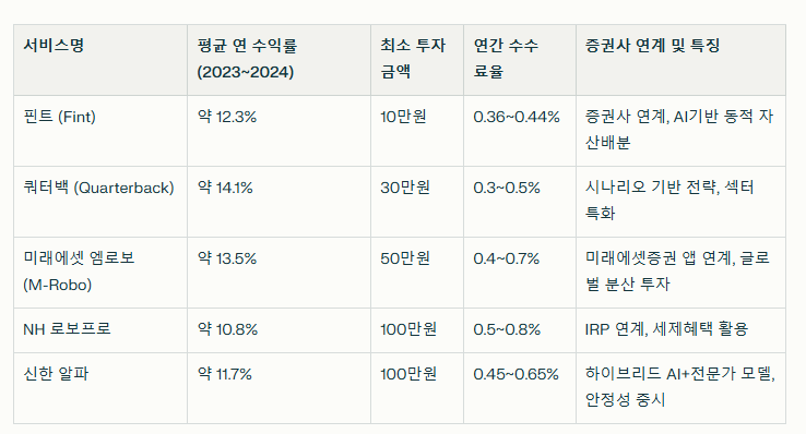 | 서비스명 | 평균 연수익률 | 최소 투자금액 | 연간 수수료율 | 증권사 연계 및 특징 |