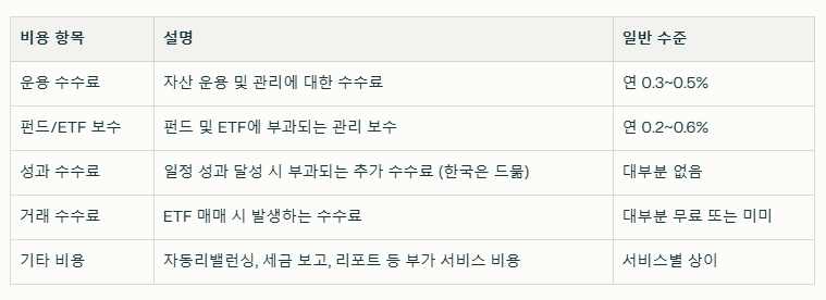 | 기타 비용 | 자동리밸런싱, 세금 보고, 리포트 등 부가 서비스 비용 | 서비스별 상이 |