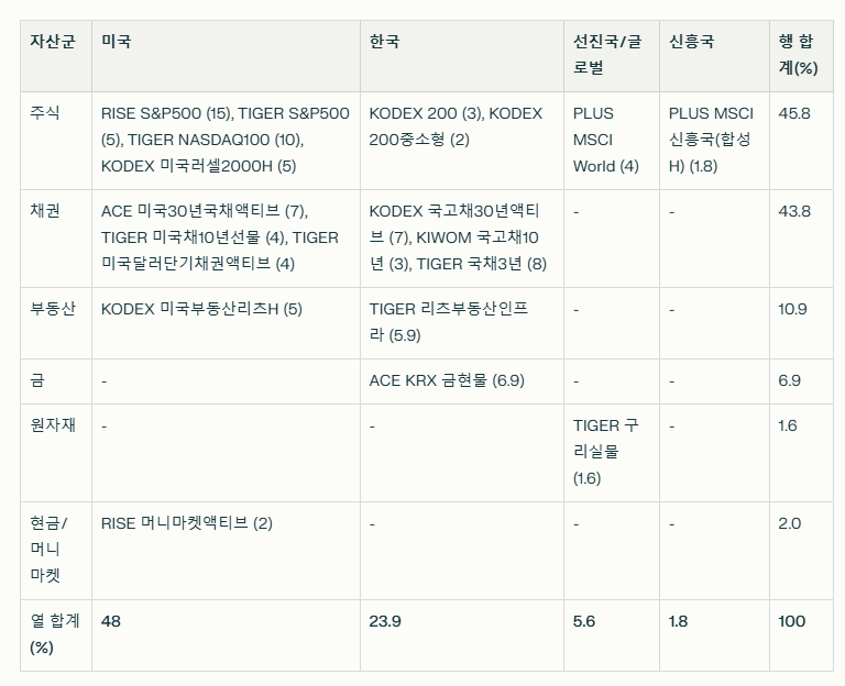 - 부동산, 금, 원자재 등 실물자산은 글로벌 ETF 중심으로 구성