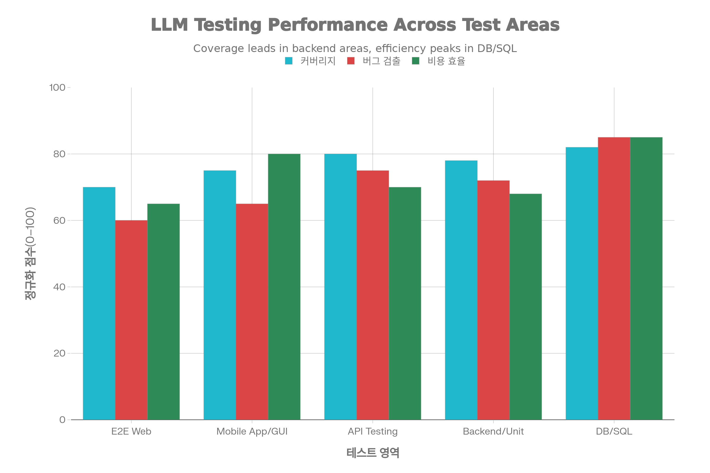 아래 표는 최근 연구들을 기반으로, 각 영역에서 LLM 기반 테스트 자동화의 "대략적인 강약"을 0–100 점수로 정규화해 정리한 것이다.[8][9][11][12][18] 절대값이 아니라, 영역 간 상대 비교용 지표로 보면 된다.