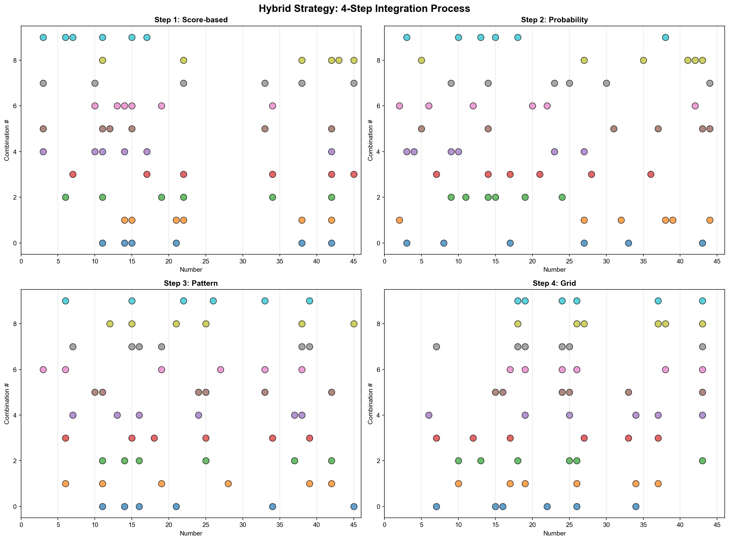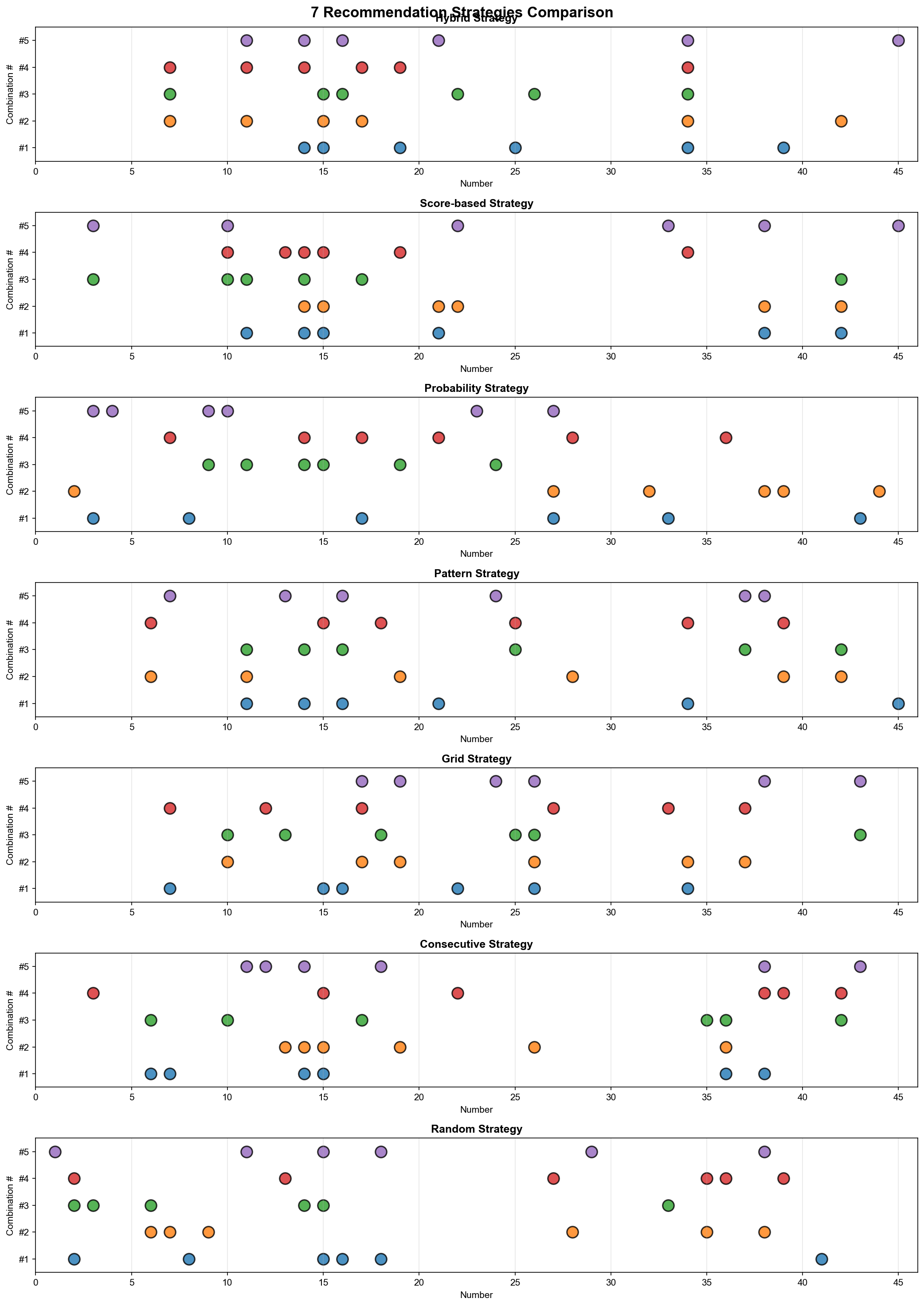 점수 기반, 확률 가중치, 패턴, 그리드, 연속 번호, 무작위... 그리고 모든 것을 통합한 하이브리드. 일곱 가지 길이 펼쳐졌다.
