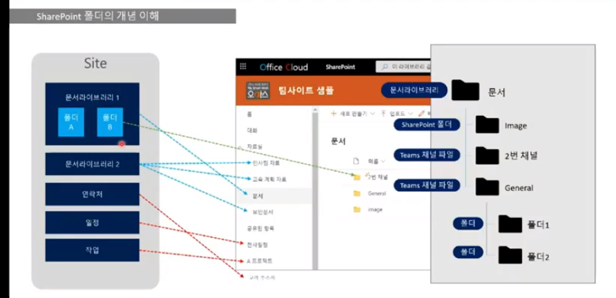 -문서라이브러리 : 기본 저장공간이며 문서라이브러리APP이 설치된 것으로 폴더와 유사하지만 상위개념임(폴더가 모여있음)