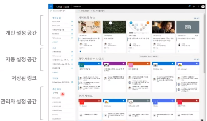 -그룹사이트 설정 및 사용:팔로우홈(즐겨찾기 공간), 최근, 저장됨(나중에 보기), 추천링크(관리자설정-링크별접속권한있어여함), 사이트뉴스, 자주사용하는 사이트, 추천사이트(O365개인맞춤화사이트)