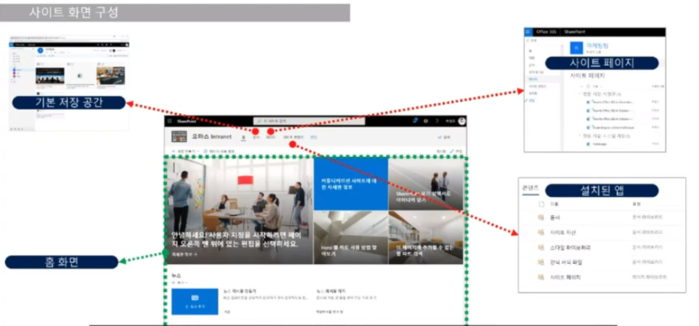-사이트 콘텐츠 : 앱설치할 수 있는 공간으로 문서 라이브러리/일정등등 있음