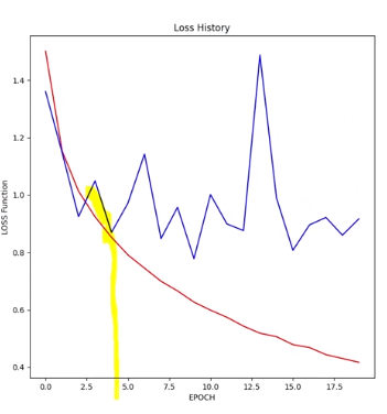 인공지능제1호 : 트레이닝과정 정확도(적)과 테스트 과정 정확도인데 정확도(성능)는 횟수가 증가할 수록 올라 가고 로스도 점점 작아지만 테스트로스와 트레이닝 로스(적)의 갭이 벌어지는 데 데이터에 너무 치정된 상태(overfitting- 편견과 비슷한 것으로 일반화하지 못하고 특정 결과만 편중된 해석을 함)