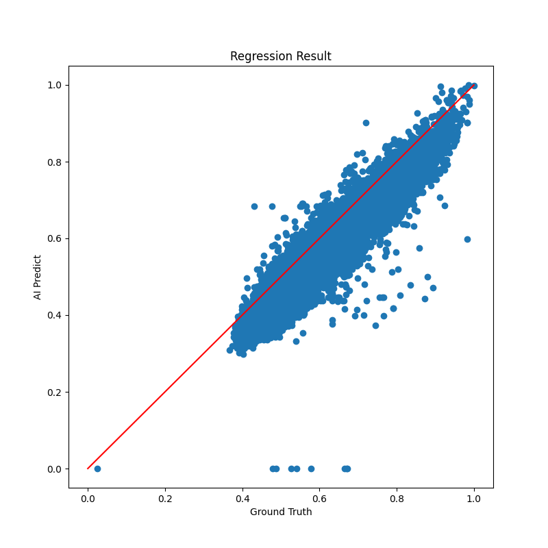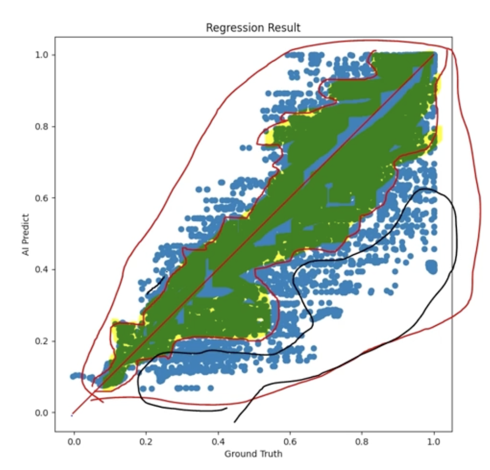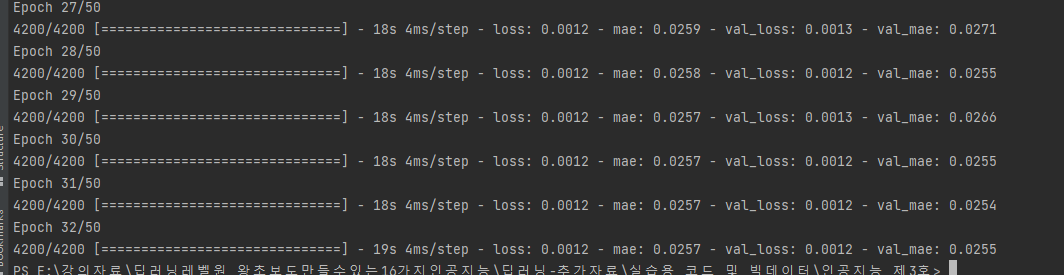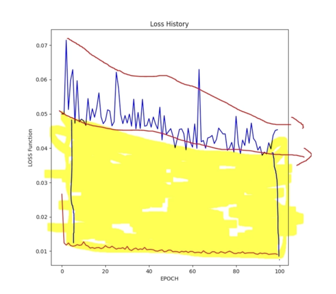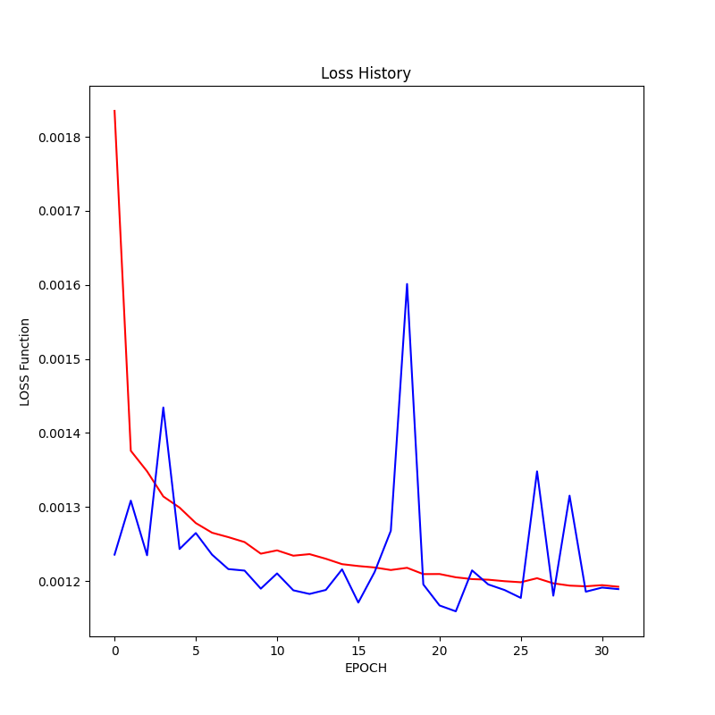 50번 하기로 했으나 어느 정도 성능이 나와서 32번에서 수행 멈추었고 정확도가 97%가 나온다고 실제값(빨간선) 주위로 분포되어 있다. 선 아래값 범위는 AI는 실제 사람들 값이 낮았을 것이다고 예측했고 트레이닝로스는 수평에 도달한것으로 보아 성능한계점에 도달한 것으로 보며 테스트는 오타차가 커지는 것을 볼 수 있다.