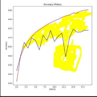 인공제능 제 6호는 CNN으로 학습하는 것으로 {Conv2D,BatchNormalization,ReLU,MaxPooling2D},Flatten,Dense등 사용하고 Dropout까지 추가한것 결과는 3회 4회에서 오버핏이 나온 것으로 보이고 정확도에서는 12회 이후 떨어졌다가 회복하네요 . 정확도만 본다면 8회-9회정도가 74%로 제일 정확합니다.