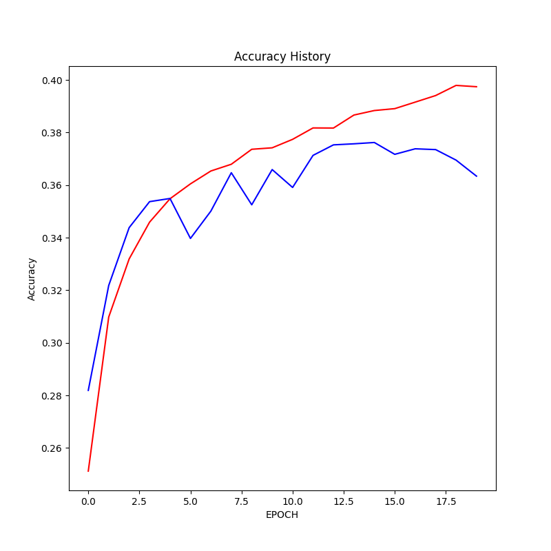 인공제능 제 5호는 FNN로 이미지 학습하는 것으로 input_shape가 32로 변경된 것으로 5만장 트레이닝 데이터와 1만장 테스트 데이터로 학습하는 것으로 정확도가 38%를 넘지 않으며 연습문제에 매몰되기 시작했지만 성능은 40%정도로 절망적이며 FNN의 한계임