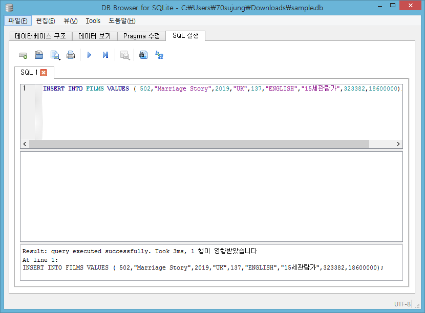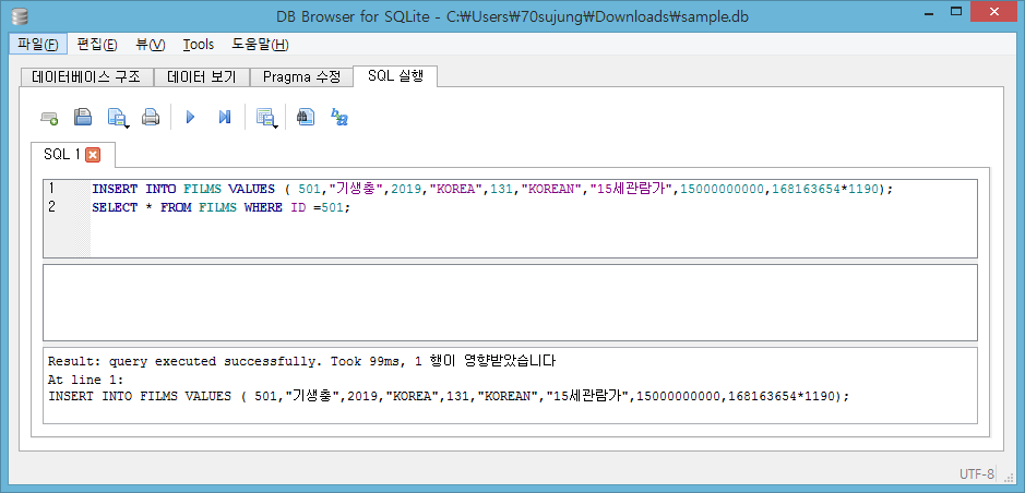 INSERT INTO FILMS VALUES ( 501,"기생충",2019,"KOREA",131,"KOREAN","15세관람가",15000000000,168163654*1190);