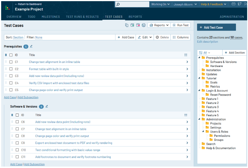 테스트케이스 종류 (싱글, ) 섹션은 테스트케이스의 모음(a collection of test cases)으로 프로젝트 모듈이나 영역에 따라 생성한다. [Sections and sub-sections are often created for specific project modules or areas of your product)참고] 단, 프로젝트 크기나 성격에 따라 다를 수 있다. 실례로 아래와 같이 조건>설치>업데이트>튜토리얼 등등으로 세션을 구성했다.