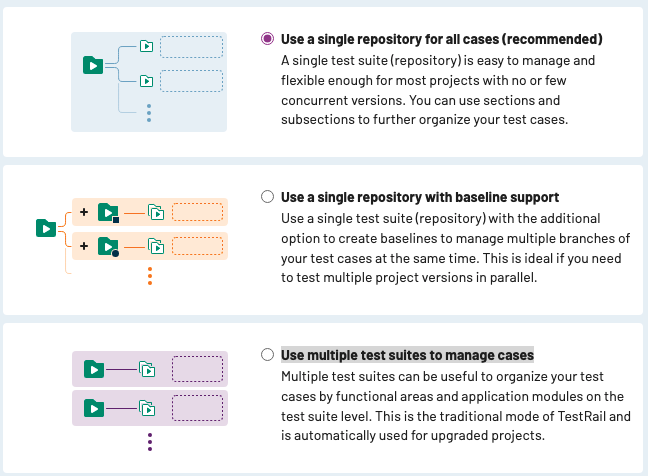 for most teams a single test repository for all cases is recommended due to its simplicity with this project type. you will have a single area in which all of your cases for that project are stored and you can further divide them into sections and subsections using a single repository keeps things simple and allows for full end-to-end testing within a single run while also maintaining flexibility around concurrent testing with versioning using milestones and test plans