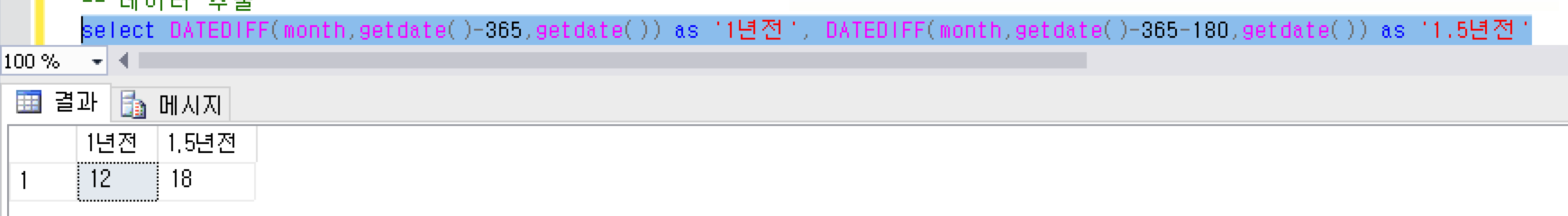 select DATEDIFF(month,getdate()-365,getdate()) as '1년전', DATEDIFF(month,getdate()-365-180,getdate()) as '1.5년전'