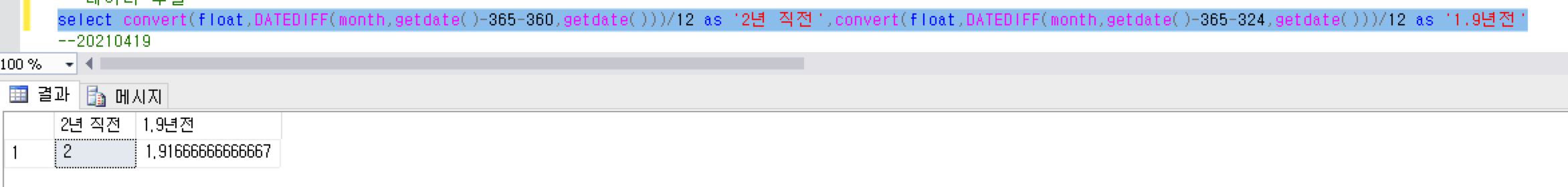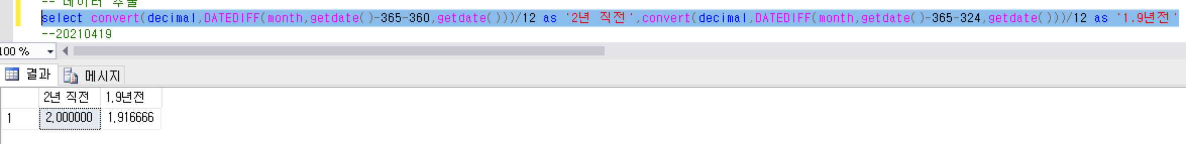 select convert(decimal,DATEDIFF(month,getdate()-365-360,getdate()))/12 as '2년 직전',convert(decimal,DATEDIFF(month,getdate()-365-324,getdate()))/12 as '1.9년전'