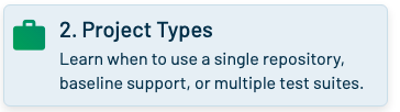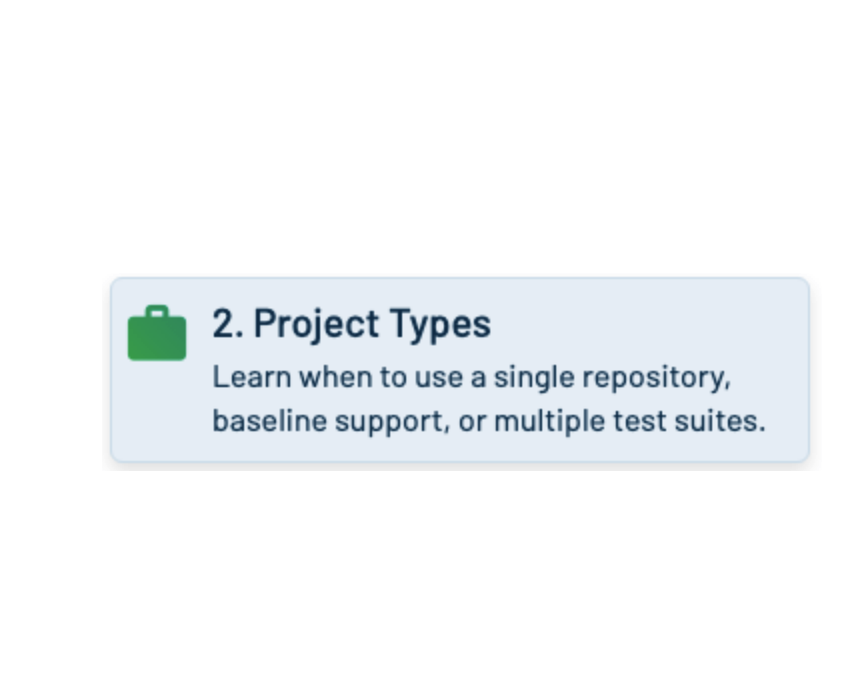 모든 경우에 대한 단일 리포지토리 기준선 지원 및 여러 테스트 제품군이 있는 단일 리포지토리. 사용하는 프로젝트 유형은 해당 프로젝트 내에서 테스트 케이스를 구성하고 관리하는 방법을 정의합니다.