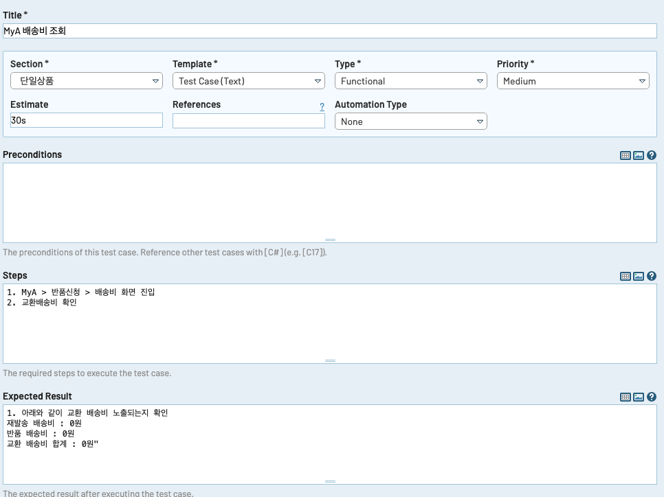 테스트케이스는 비교적 쉽게 생성할 수 있다. 테스트 섹션 만들고 아래에 쭉 테스트케이스(타이틀)을 쭉 넣어준다. 그리고 중간에 섹션을 추가한 후 이전 작성한 테스트케이스를 가지고 올수도 복사할 수도 있다. 이후 세션 하위 테스트 케이스로 들어가서 타이틀외 템플릿 등 채운다. (간단해서..생략.)